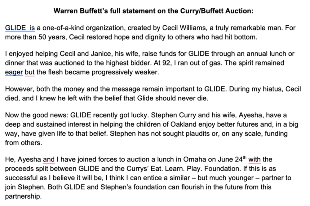 值得注意的是,在重启午餐的声明中,巴菲特特别提到:“如果这次活动能如我预期般成功,我相信自己还能吸引到一位类似、但更年轻的合作伙伴加入斯蒂芬的行列。通过这样的合作,GLIDE和斯蒂芬的基金会都将在未来持续发展、不断壮大。”