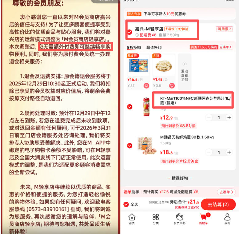 壹览商业了解到,早在2025年12月,位于嘉兴的M会员商店就已率先完成改造,以“轻享店”的新形式亮相。这一新模式的核心变化有:取消会员准入限制、配送业务由“大润发优鲜”承接,并且在卖场内引入部分大润发的自有商品。