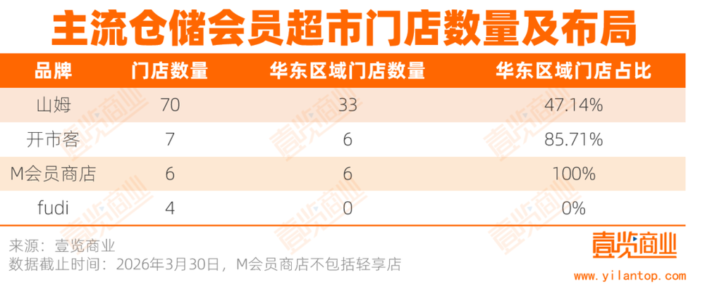 在竞争方面,以山姆为代表的国际成熟品牌正加速布局。以华东地区为例,据壹览商业不完全统计,截至2026年3月,山姆在全国共有70家门店,其中33家位于华东;开市客共有7家门店,其中6家位于华东。