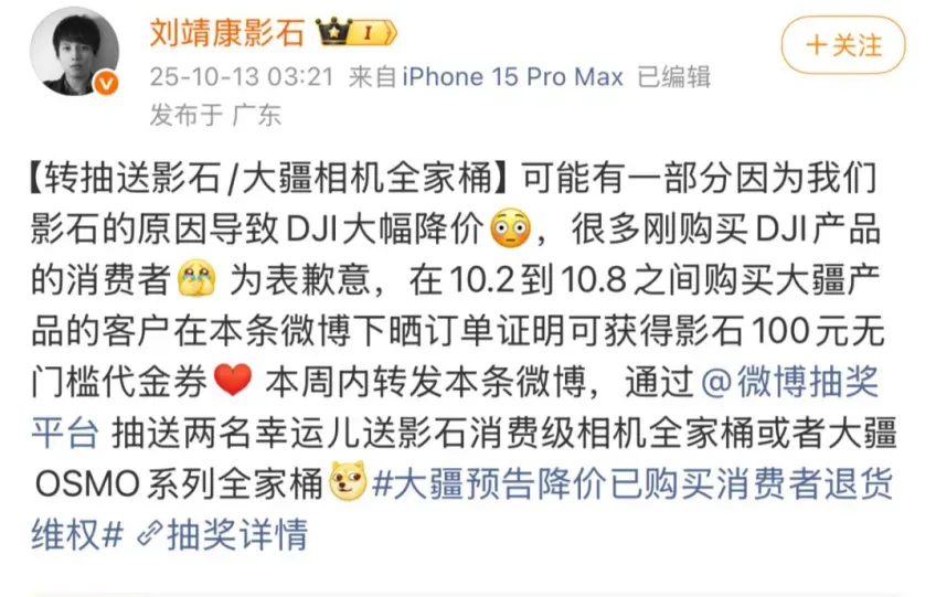 影石并非首次用“挑战者叙事”,去年曾多次主动对标大疆,如称大疆降价与影石有关、发布无人机后提外部压力。这种对标头部的传播方式短期能获关注,但长期易引发争议,且影石市值已超700亿,再以“弱者”自居易致认知错位。