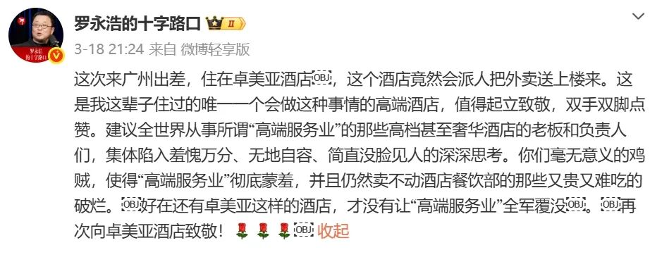 事情的起因是罗永浩在广州卓美亚酒店入住时,酒店安排工作人员将外卖送至客房,他不禁感慨:“这是我住过的唯一一家会提供这种服务的高端酒店。”