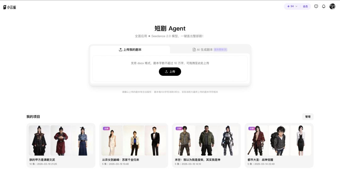 3月19日,字节跳动旗下的小云雀AI宣布上线短剧Agent功能,用户最多可上传10万字剧本,一键生成视频成片。无需真人拍摄、AI全程搞定,零基础用户也能轻松制作专业级短剧,这对普通用户和专业创作机构都将产生重要影响。