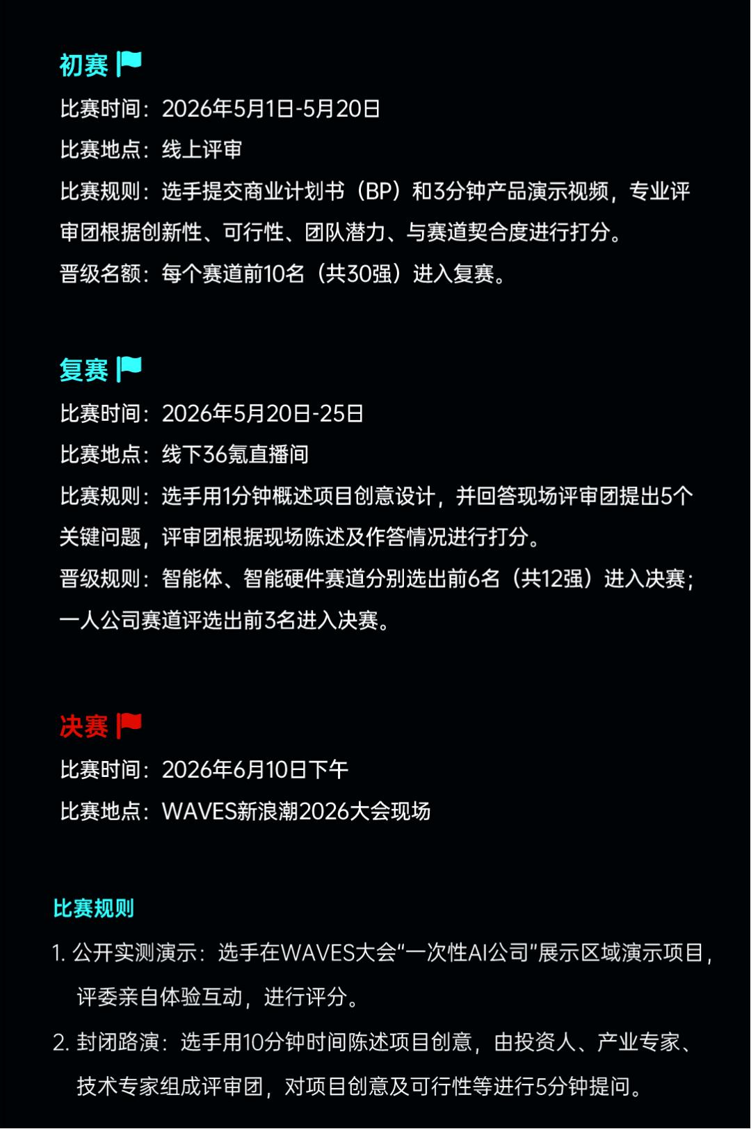 若能晋级决赛,你将登上WAVES的舞台——这是中国创投圈极具影响力的舞台之一,台下坐着投资人、产业伙伴以及未来的用户。过去许多知名创业者,都是从这里被发现、被认可、被加速成长。2026年夏天,我们希望与你共享这个舞台。