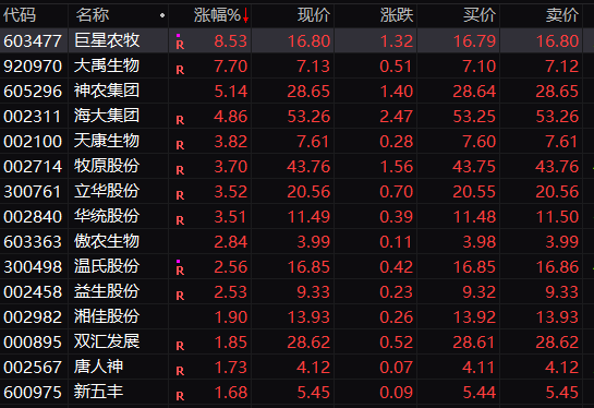 A股概念板块里,猪肉概念股上午走势强劲,龙头股牧原股份盘中涨幅超5%,温氏股份盘中涨幅一度接近5%,巨星农牧盘中触及涨停,神农集团盘中涨幅超7%。