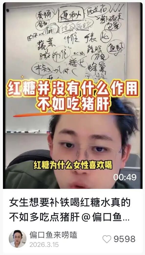 他还戳破“红糖补血”的迷思:红糖铁含量极低,补铁不如吃猪肝,喝红糖感觉舒服只是因为糖分提供的热量,并非“补血”功效。