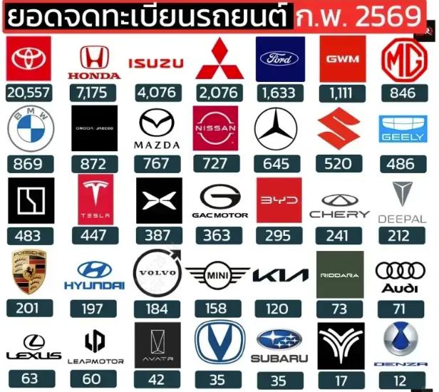 2026年2月泰国各汽车品牌销量图(来源:car250)