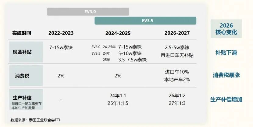 然而,政策的“蜜月期”终有结束的一天。2026年2月,泰国推出“EV 3.5”政策,补贴大幅缩水:现金补贴最高仅5万泰铢(约1万元人民币),且仅限本土生产车型;进口车消费税从2%回升至10%。这一调整直接导致依赖进口车型的中国品牌成本上升,比亚迪海豚等车型提价超3成。数据显示,泰国2月纯电汽车销量仅6168辆,较1月暴跌八成,而中国品牌占据该市场超80%的份额,受冲击最为严重。