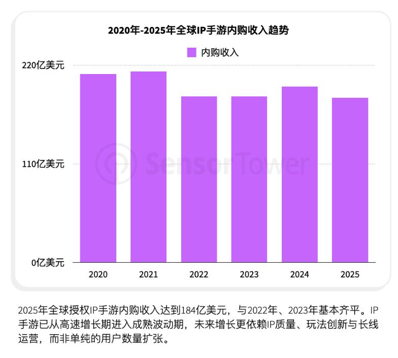 不过,报告中一个核心点引起了ACGx的注意:2025年全球授权IP手游内购收入达184亿美元,与2022年、2023年基本齐平。这表明IP手游已从高速增长期进入成熟波动期,未来增长更依赖IP质量、玩法创新与长线运营,而非单纯的用户数量扩张。