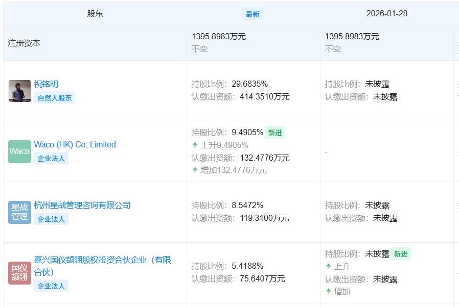 “天眼查”数据显示,创始人祝铭明等初始团队股东的合计持股比例从增资前的99%降至约42%。目前灵伴科技前三股东分别为祝铭明(29.68%)、Waco (HK) Co. Limited(9.49%)、杭州星战管理咨询有限公司(8.55%),后两家公司分别由灵伴科技和祝铭明个人控股。