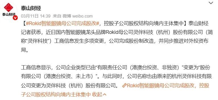 其中,Rokid的母公司灵伴科技近期频繁推进资本运作:通过增资扩股、股权结构调整,老股东持股比例被显著稀释;今年,Rokid最新两轮融资还引入了多家产业巨头。外界普遍将这些动作视为Rokid冲刺IPO的信号,不过Rokid方面尚未对此传闻作出官方回应。