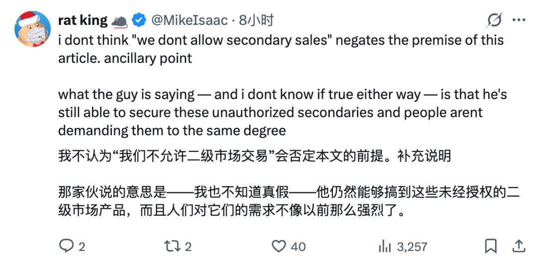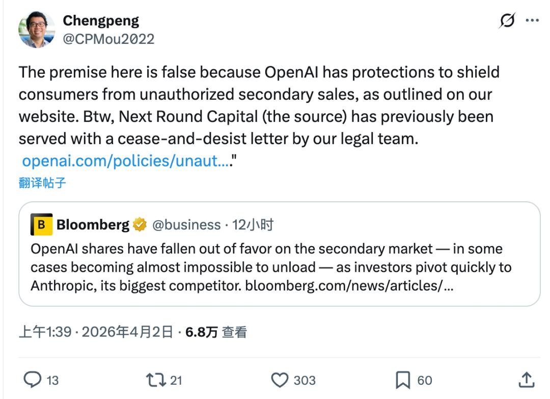 面对滞销传闻,OpenAI员工在X平台反驳,称公司有严格优先购买权和转让禁令。