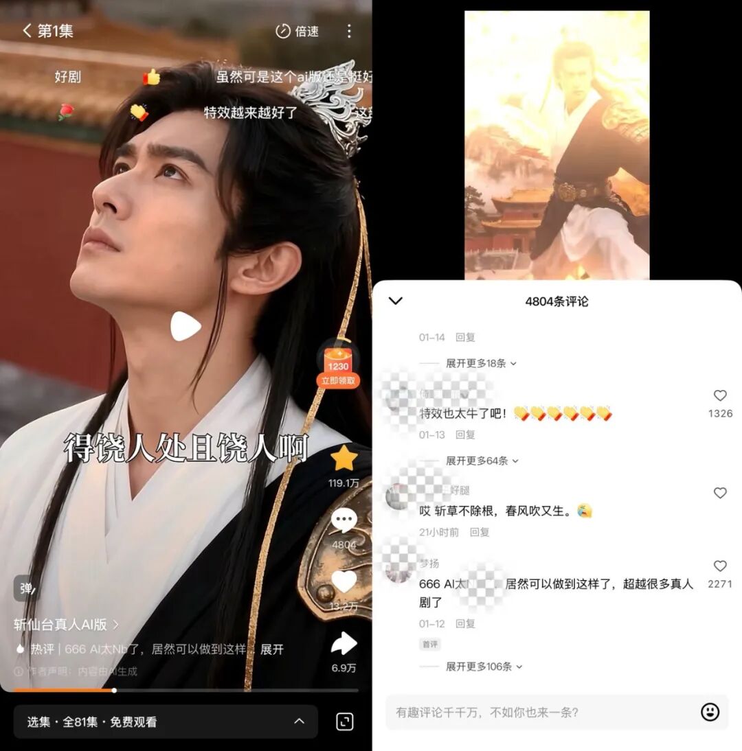 不久前上线的《斩仙台真人AI版》,数据表现同样亮眼。6天播放量即破亿,并登顶红果漫剧热播榜等多个AI短剧榜单。评论区好评如潮,讨论多集中在剧情和人物本身,很少出现对AI表演僵硬、难以代入等常见吐槽。