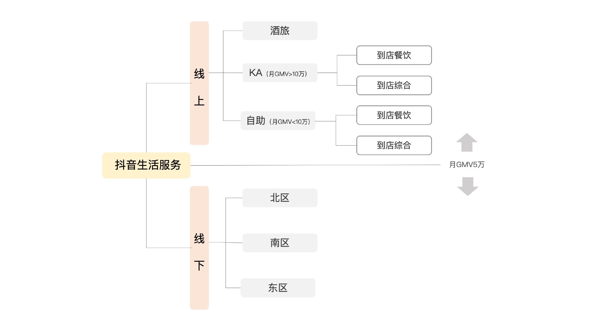 调整后,月GMV5万以上的商户划归线上部门,细分为三大板块:KA(月GMV10万以上)、自助(月GMV5-10万)及酒旅。其中KA与自助板块进一步按行业拆分,涵盖餐饮和到店综合品类。而月GMV5万以下的中小商户则归入线下部门,线下按区域划分为北区、南区、东区——相比此前的区域设置,此次砍掉了上海大区与中区,原中区商户分流至北区和东区。
