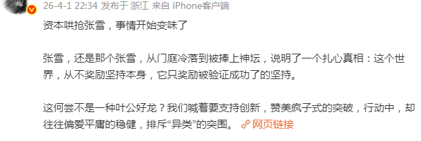 对于张雪爆火后被资本追逐的现象,有人表示:“资本哄抢张雪,事情开始变味了!张雪还是那个张雪,从门庭冷落到被捧上神坛,说明了一个扎心的真相:这个世界从不奖励坚持本身,它只奖励被验证成功了的坚持。这何尝不是一种叶公好龙?我们喊着要支持创新,赞美疯子式的突破,行动中却往往偏爱平庸的稳健,排斥‘异类’的突围。”