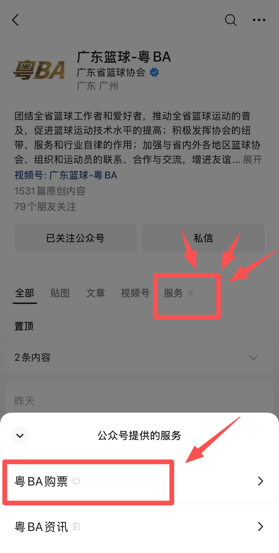 1. 打开“广东篮球-粤BA”微信公众号,点击菜单栏的“服务”,再点击“粤BA购票”进入购票系统。