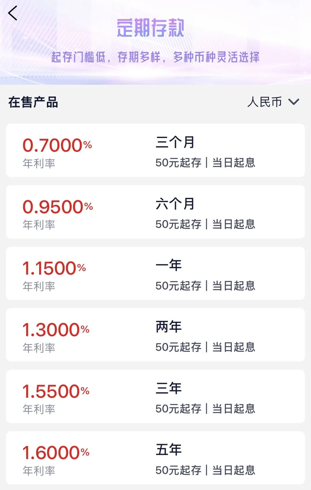 浙商银行的利率为:3个月0.7%、6个月0.95%、1年1.15%、2年1.3%、3年1.55%、5年1.6%。