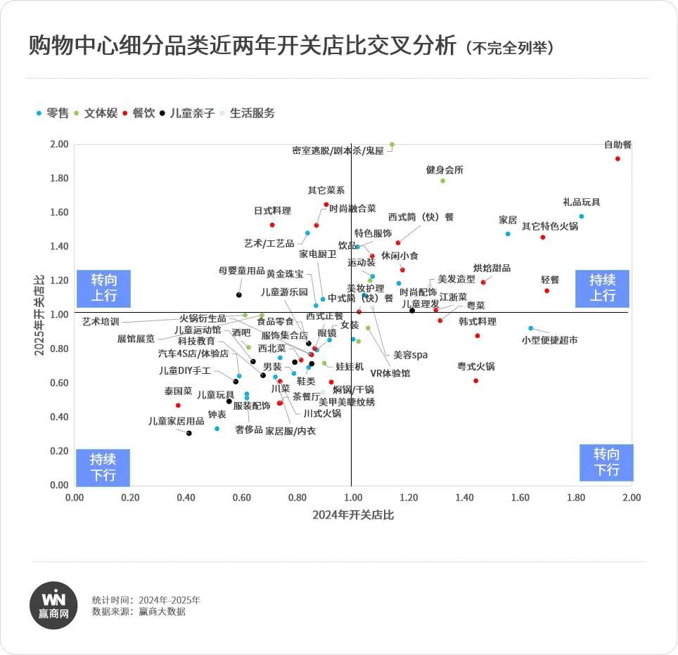 与2024年相比,五大业态中,零售和儿童亲子仍是仅有的两个延续收缩趋势的业态。不过,若细分到具体品类,内部则出现了明显的结构性分化。