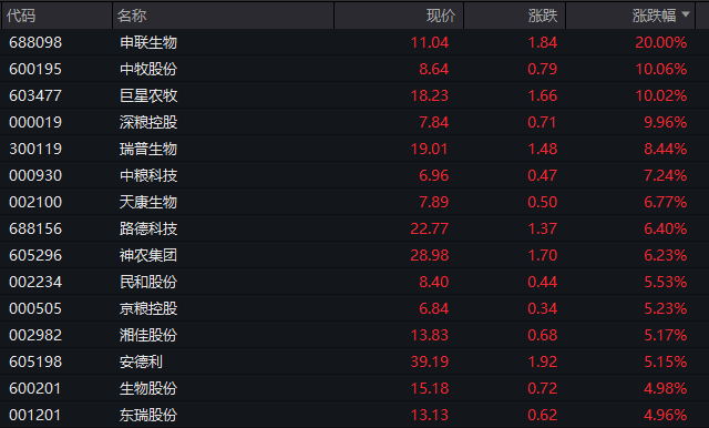农林牧渔板块同样表现强劲,涨幅超2%,申联生物20%涨停,中牧股份、巨星农牧等个股也纷纷涨停。