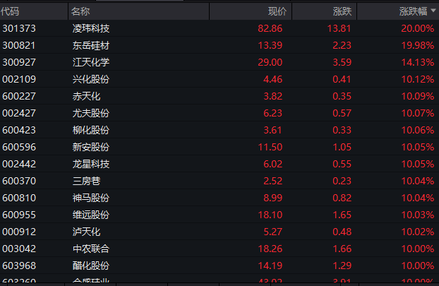 从申万一级行业来看,基础化工板块涨幅超2.6%。其中,东岳硅材(300821)开盘仅1分钟便封死20%涨停板,凌玮科技随后也拉升至20%涨停,此外,兴化股份、赤天化、尤夫股份、柳化股份等近20只个股收获10%涨停。