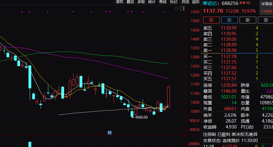 个股方面,寒武纪上午股价大涨,截至收盘涨幅超10%,报1137.78元/股,总市值接近4800亿元。