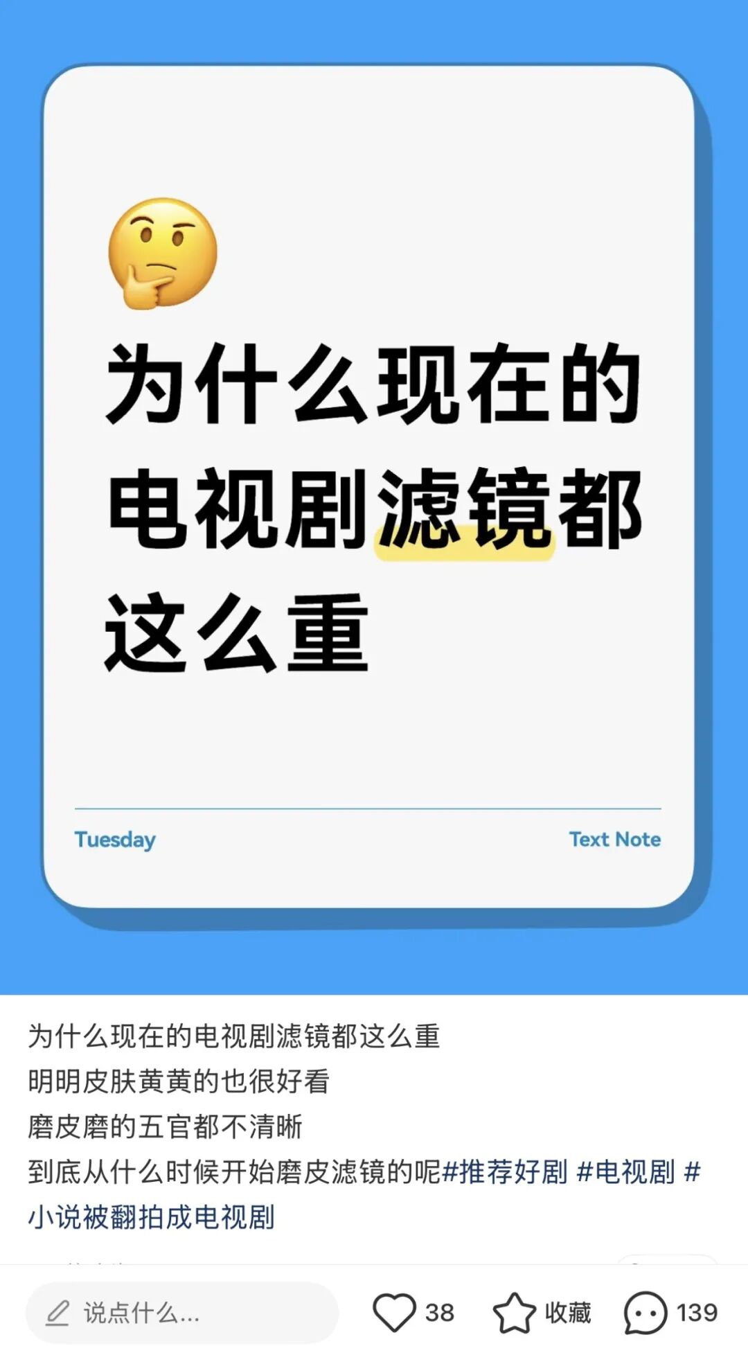 为满足观众不断提升的审美需求,最直接的方式就是加大滤镜使用。滤镜的过度应用让演员五官被磨平、皮肤质感消失、画面失真,甚至出现人脸与背景分层的诡异效果。