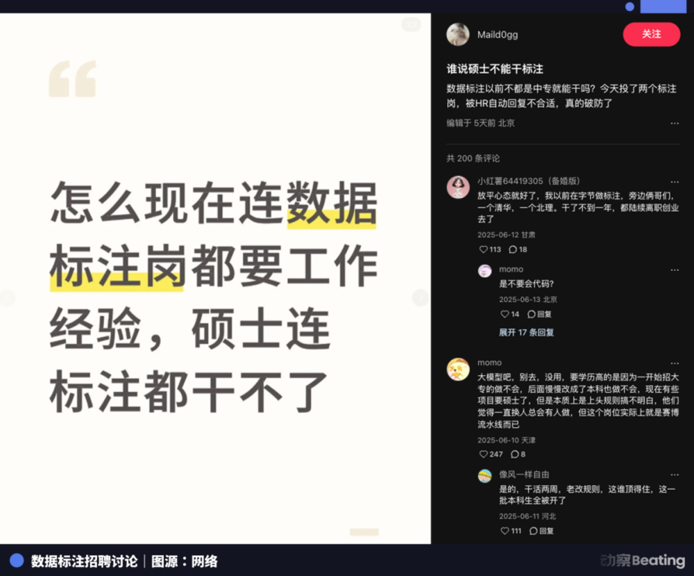 招聘平台频繁出现“大模型逻辑推理标注”“AI人文训练师”等兼职,门槛高,要求“985/211硕士及以上学历”,涉及法律、医学等专业领域。