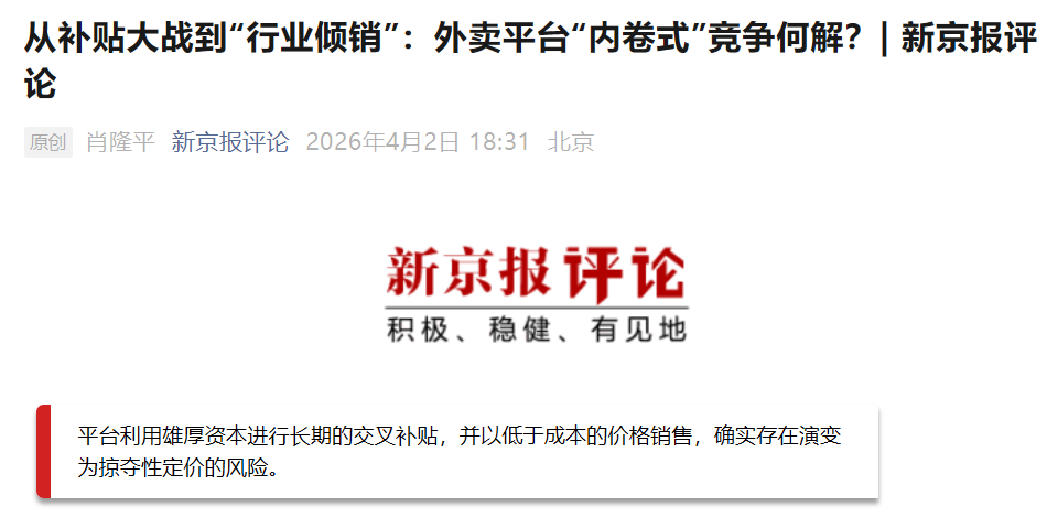 补贴从2025年持续至2026年,早已超出促销范畴;新进入的大平台明显意在抢夺份额、独占市场,这与“掠夺性定价”特征高度吻合。