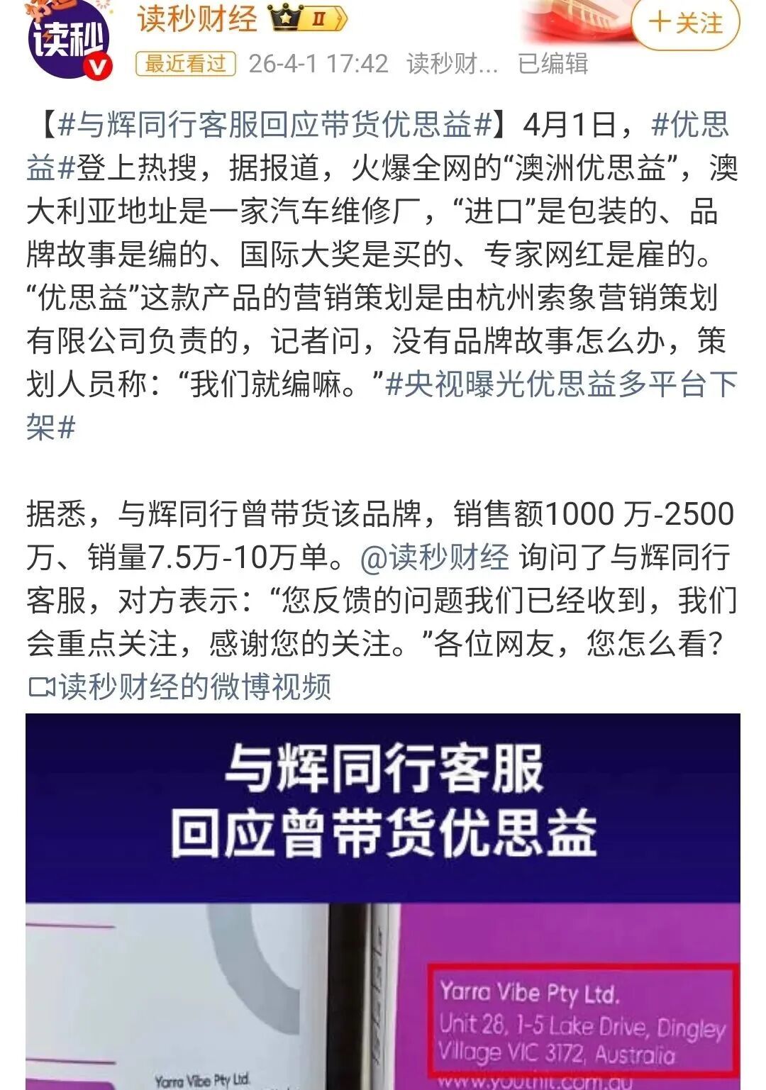 然而,央视3·15打假报道揭露优思益造假:号称澳洲进口、有研发中心和TGA认证全是谎言,生产地址实为修车厂,产品国内代工且无“蓝帽子”标识却宣传保健功能。与辉同行直播间是其核心销售渠道,带货量占总销量近四成。