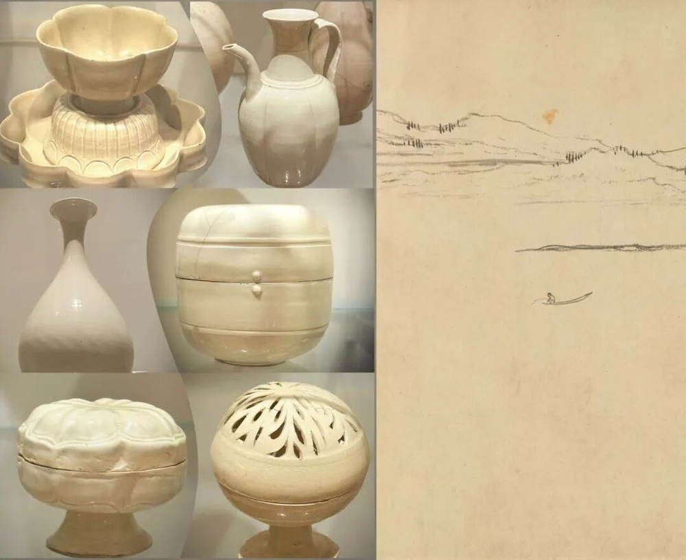 (左:定窑白瓷,现藏于加拿大多伦多皇家安大略博物馆;右:元代画家赵孟頫《双松平远图卷》,现藏于美国大都会艺术博物馆)