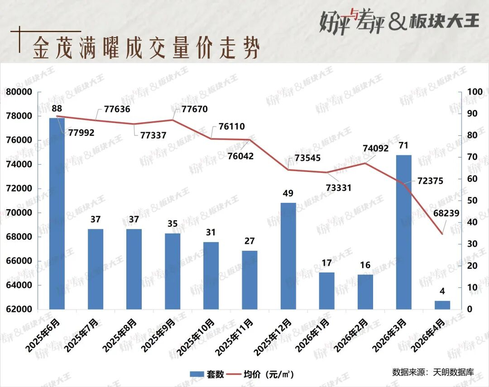 第一类是传统热销盘降价。典型代表为金茂满曜和朝棠揽阅,2026年3月网签均价均为历史最低。