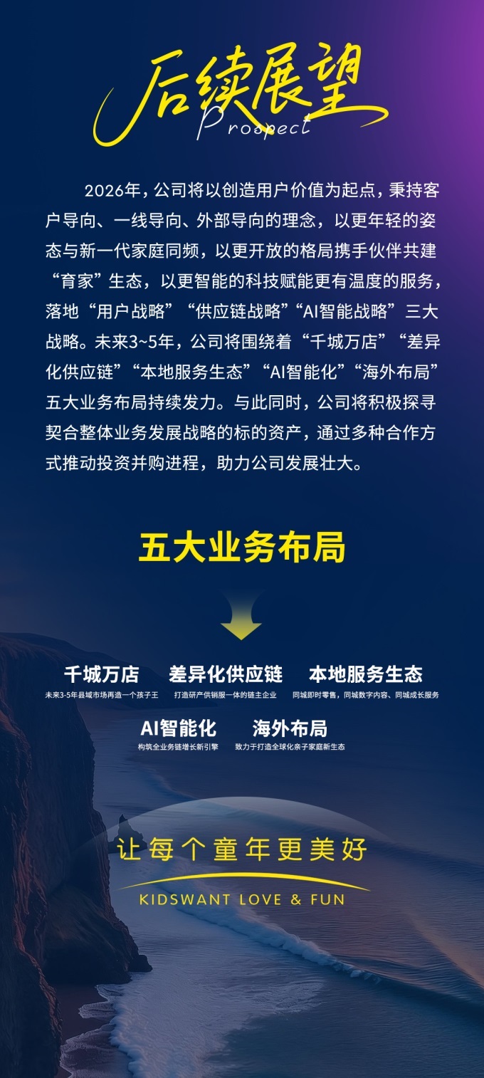 展望2026年,孩子王正围绕六大方向稳步推进战略实施:持续升级和扩展门店网络,加速“千城万店”战略布局;深化用户运营体系升级,提升用户体验与单客价值;持续推进自有品牌战略,打造研产供销服一体化供应链链主企业;大力发展同城业务,打造同城亲子家庭服务首选平台;全面推进人工智能应用,构建全业务链增长新引擎;深化全球化战略布局,重点聚焦东南亚市场,加快打造具有国际影响力的亲子家庭服务品牌。