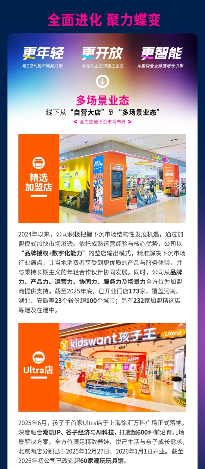 2025年全年,孩子王始终聚焦核心业务,坚定执行“全球优选差异化供应链+本地亲子成长服务+同城即时零售”战略,深入推进“扩品类、扩赛道、扩业态”的发展策略,重点布局“复购、加盟、同城数字化”三大关键领域。