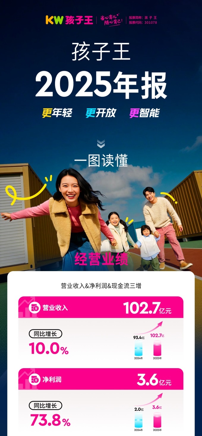 财务数据显示,2025年孩子王实现营业收入102.7亿元,同比增长10%;净利润3.6亿元,同比增长73.8%,年度营业收入首次突破百亿元。