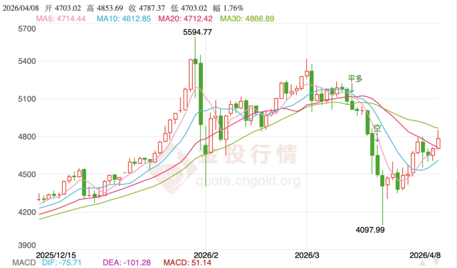2026年初,金价冲高至5596美元/盎司(约合人民币3.82万元/盎司),3月20日一度下探至4098美元/盎司(约合人民币2.79万元/盎司),4月8日又重回4800美元(约合人民币3.28万元)上方。相较于2024-2025年的稳定上涨趋势,2026年的金价更难预测。