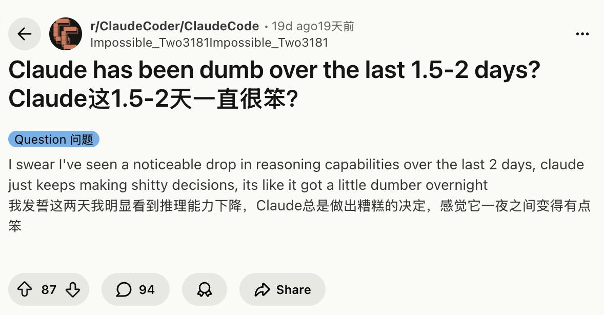 大约从今年2月起,Claude和Claude Code迎来了「史诗级性能下滑」。Reddit的r/ClaudeCode和r/ClaudeAI板块中,相关吐槽帖子刷屏,有人直接发帖《4.6 Regression is real!》,有人抱怨「Claude Code在过去1.5到2天里变得很笨」。