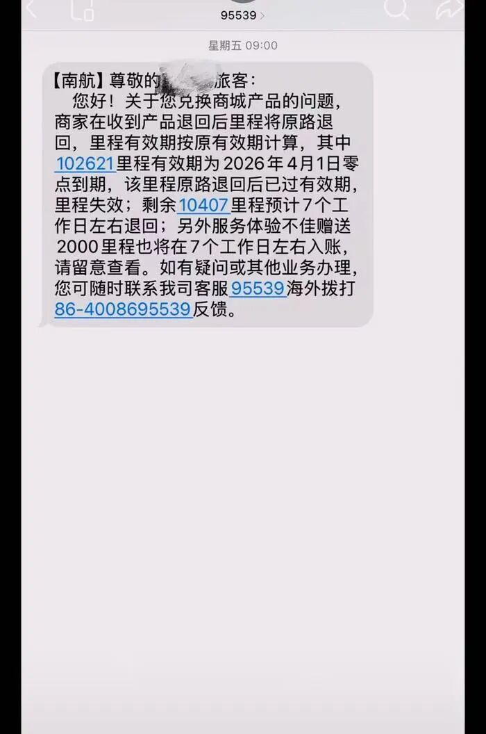 退货过程中,由于前期沟通反复、处理周期延长,她账户里的部分里程在4月1日到期。4月3日,当事人收到南航通知,称“退回里程已过期作废”。