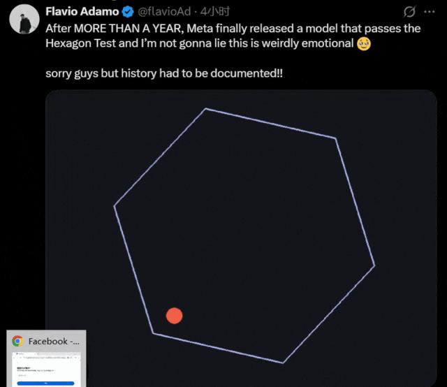 Muse Spark还通过了小球弹跳测试。有网友感慨,时隔1年多,Meta终于推出了能通过六边形小球弹跳测试的大模型,这一时刻值得记录。
