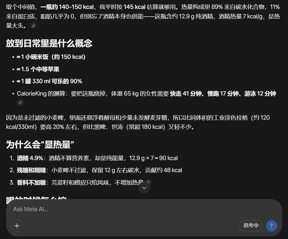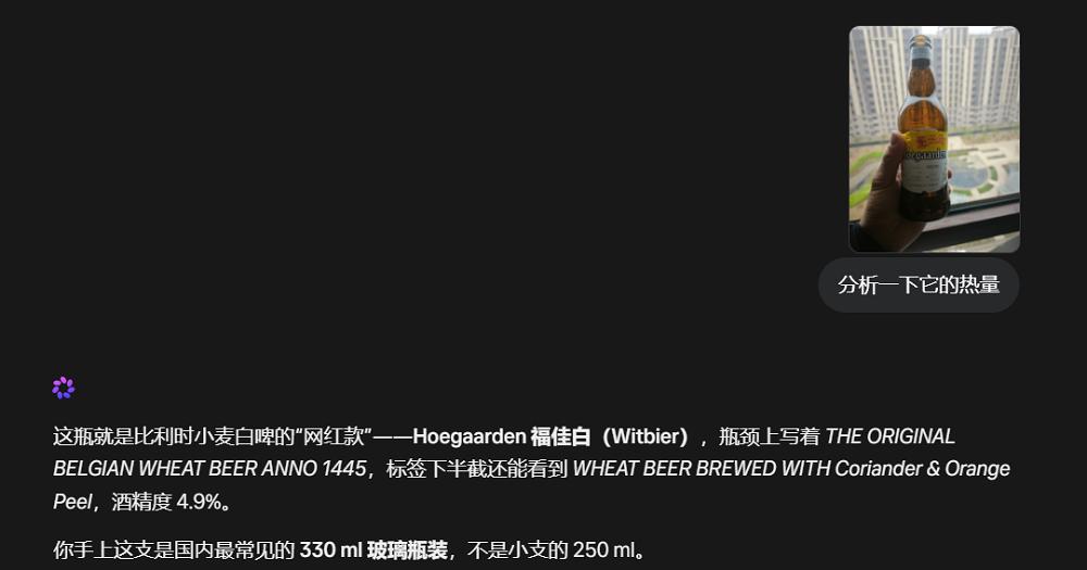 其多模态能力表现出色:上传啤酒瓶照片后,Muse Spark准确识别出品牌、容量,甚至原图中肉眼难辨的酒精度。