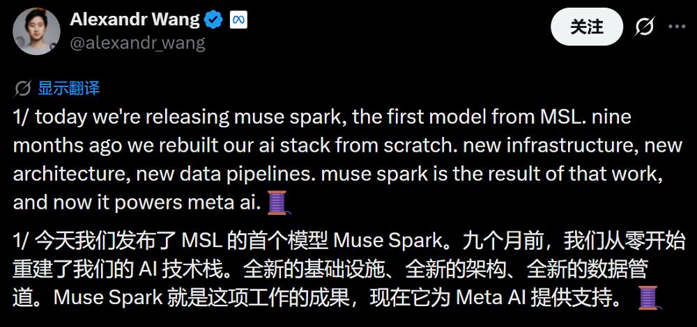 Muse Spark是ScaleAI创始人、Meta首席AI官汪滔(Alexandr Wang)加入Meta 10个月后交出的首份答卷。