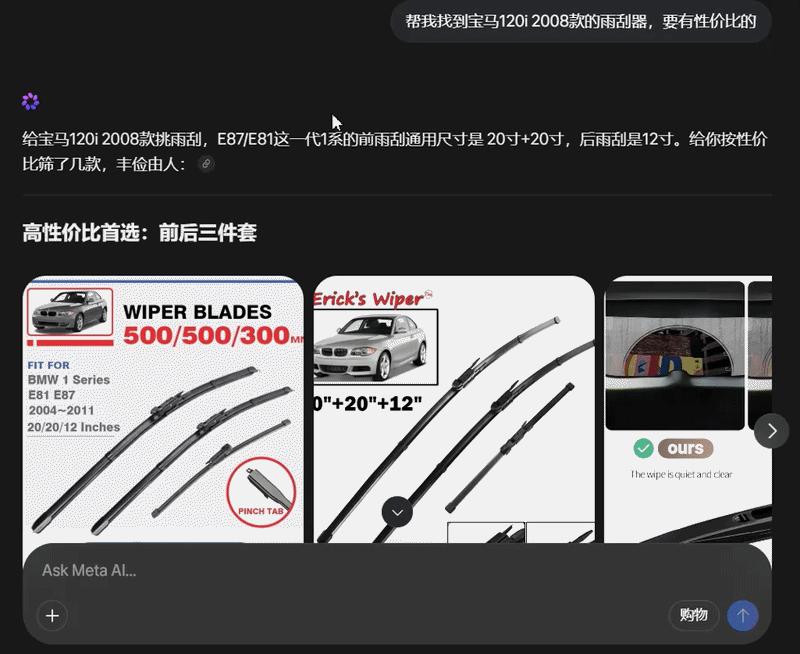 Muse Spark还可用于购物推荐:我们让它搜索汽车雨刮器,几秒内就给出多个选项,包含每款产品的优劣势分析及最终购买建议。
