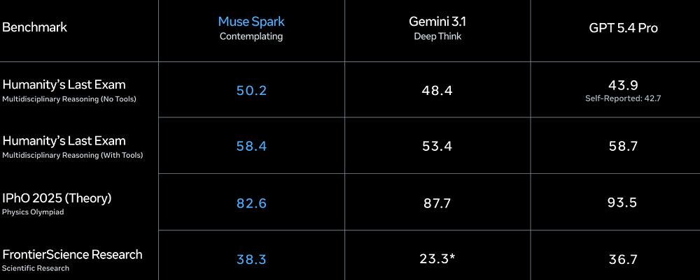 开启“沉思模式”后,Muse Spark在复杂任务中的能力显著提升,例如在HLE“人类最后的考试”基准测试中正确率达58%,在“前沿科学研究”基准测试中正确率为38%。