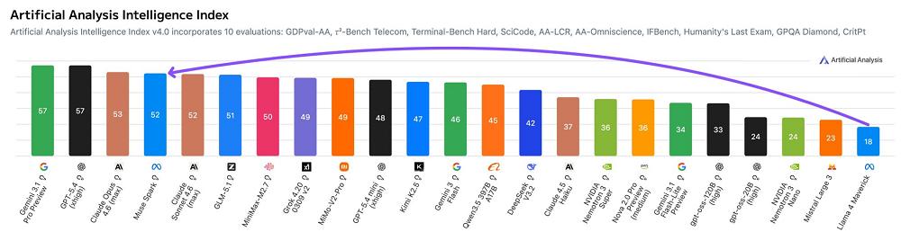 在大模型测评平台Artificial Analysis上,Muse Spark的智能指数从Llama 4 Maverick的18分跃升至52分,介于Claude Sonnet 4.6与Claude Opus 4.6之间,成功跻身行业第一梯队。