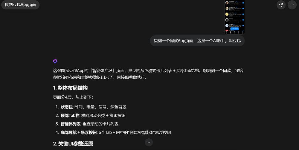 我们第一时间体验该模型,上传豆包App截图并要求复刻。可以看到,Muse Spark的回复风格偏口语化,甚至带有“豆包味儿”,这或许与其面向C端用户的定位有关。
