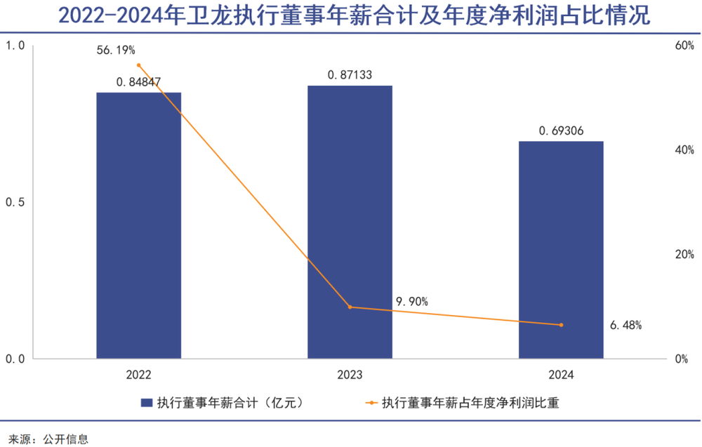 此外,卫龙高管薪酬高昂:2022—2023年执行董事兼首席执行官孙亦农薪酬近4000万元;2022—2024年执行董事兼首席财务官彭宏志薪酬超5000万元;家族成员刘忠思三年平均年薪超1800万元,陈林两年平均年薪超1400万元,2024年新任余风年薪超1300万元。2022—2024年,卫龙每年董事薪酬达8484.7万元、8713.3万元、6930.6万元,而2022年净利润仅1.51亿元。