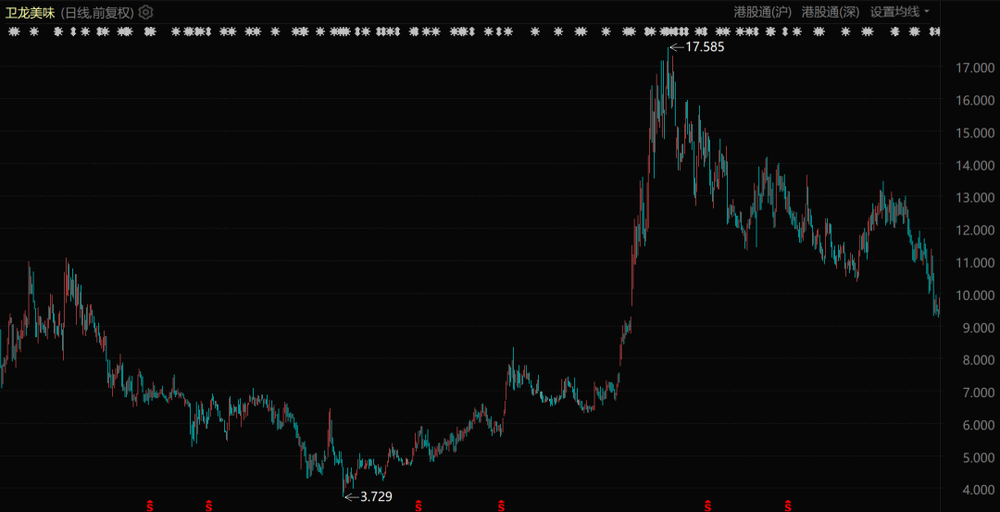 然而,业绩攀升与股价低迷形成鲜明悖论。上市首日破发后,股价持续在低谷挣扎:2024年跌至4.199港元,市值蒸发超百亿元;2025年短暂反弹至17港元后,年报发布又跌回发行价下。三年多来,卫龙始终未能摆脱破发魔咒,市场悲观预期未改。