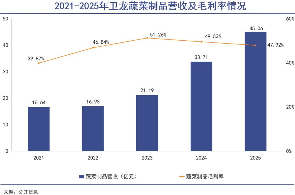2014年卫龙推出魔芋爽,经十余年培育,这款主打“Q弹脆爽、低卡高纤”的产品迎来爆发。2025年蔬菜制品收入达45.06亿元,同比增长33.67%,营收占比从2024年的53.79%升至62.38%,取代辣条成为增长主力。