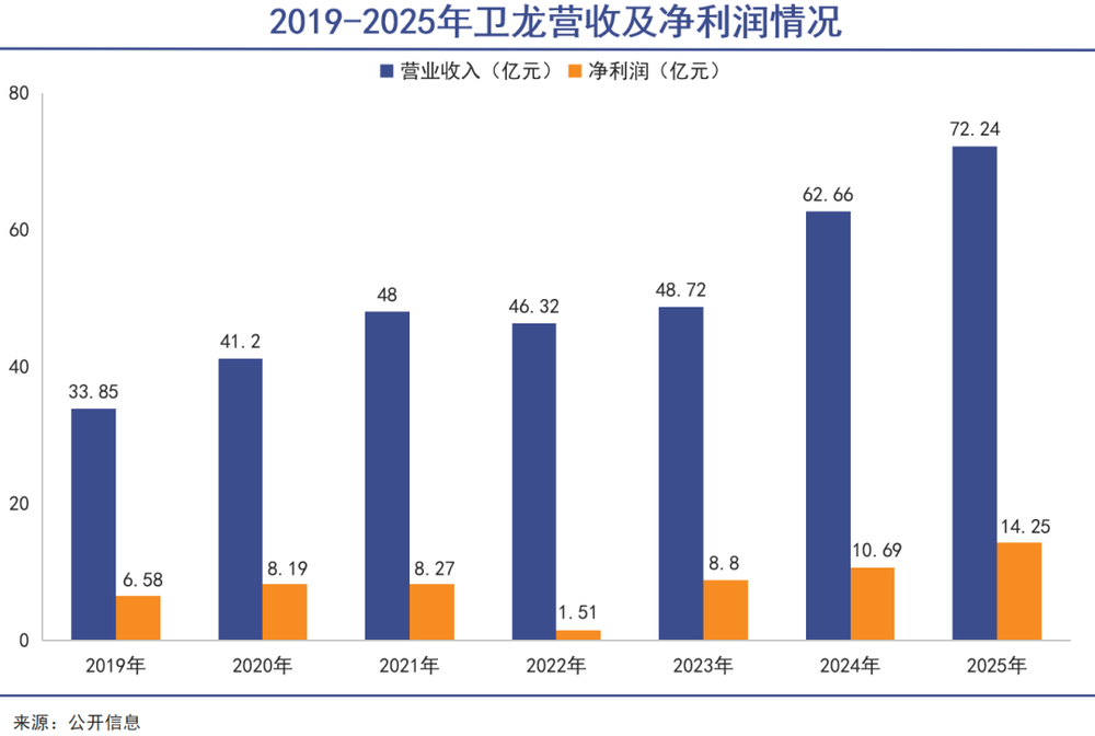 依托两大王牌产品,卫龙业绩稳步增长:营收从2019年33.85亿元翻倍至2025年72.24亿元;净利润从6.58亿元增长至14.25亿元,同样实现翻倍。