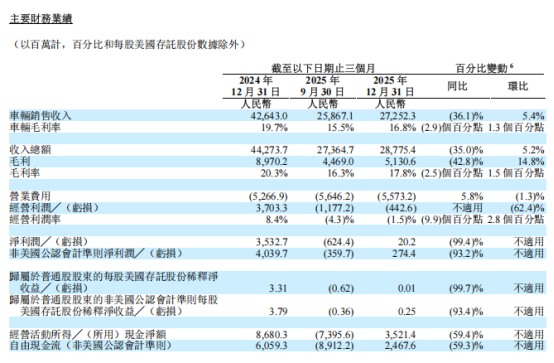 不久前发布的财报数据侧面揭示了增长背后的成本:2025年第四季度营收288亿元,同比降35.0%;净利润2020万元,同比降99.4%。全年营收1123亿元,同比降22.3%;净利润11.39亿元,同比降85.8%。