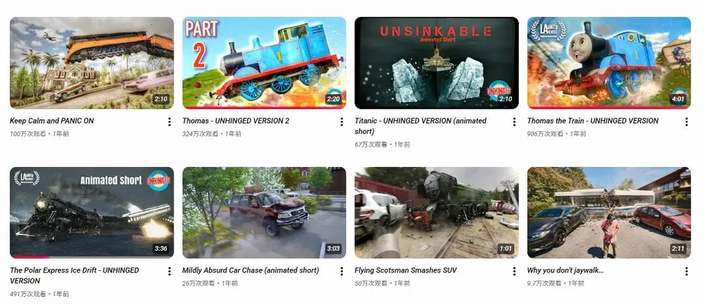 该工作室播放量最高(近900万)的视频,就是托马斯二创车祸视频,不讲剧情逻辑,就是撞车、脱轨循环。