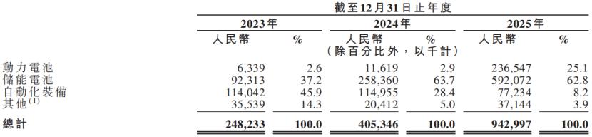 按收入来源划分,2025年公司动力电池业务收入占比为25.1%,储能电池业务收入占比为62.8%,均较2023年有所提升;而自动化装备业务收入占比为8.2%,较2023年有所下降。